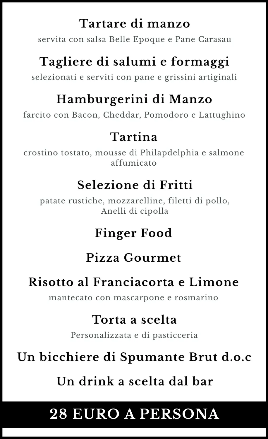 Finger food, pizza gourmet, dolci di alta pasticceria, e drink unici. Il tutto accompagnato da musica live o DJ set e con la possibilità di un servizio fotografico dedicato.